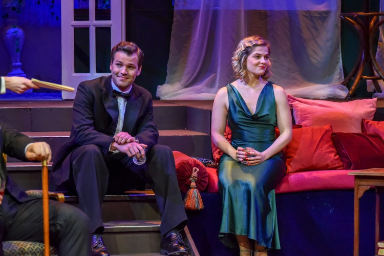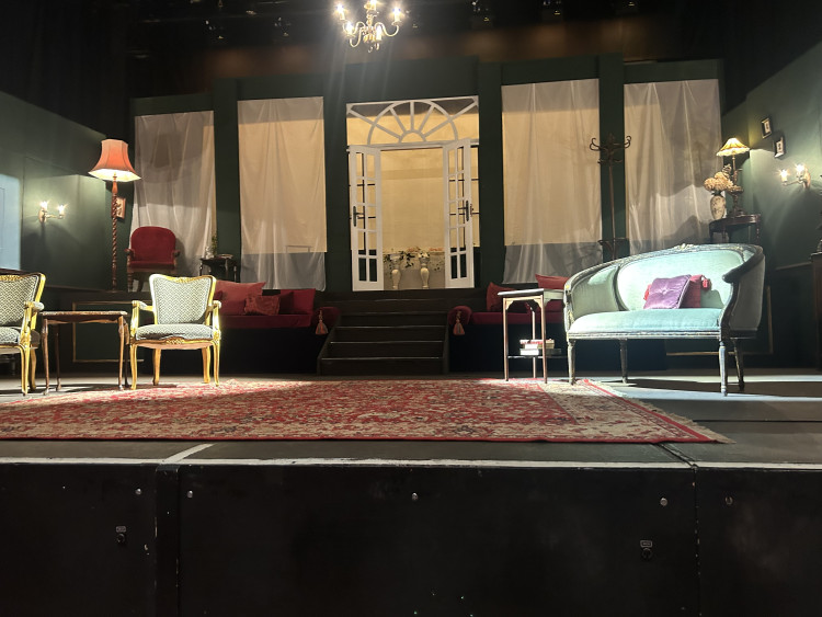 The stage setting remains the same throughout the play, representing a glamorous, vintage living room with an opaque balcony overlooking the sea, which one could imagine a wealthy family in the 1930s would have owned.