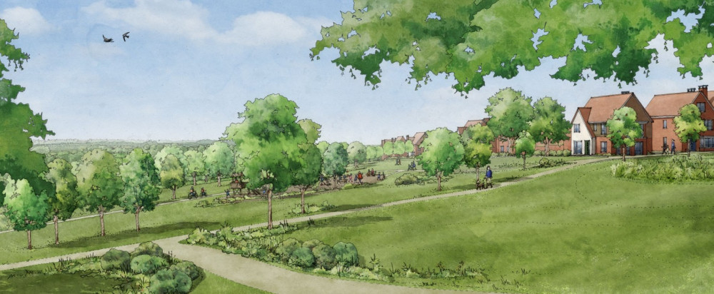 The development would include a mix of homes and four-storey apartment blocks, and proposes a 14-acre public park, along with new trees and paths to connect the site to the wider area.