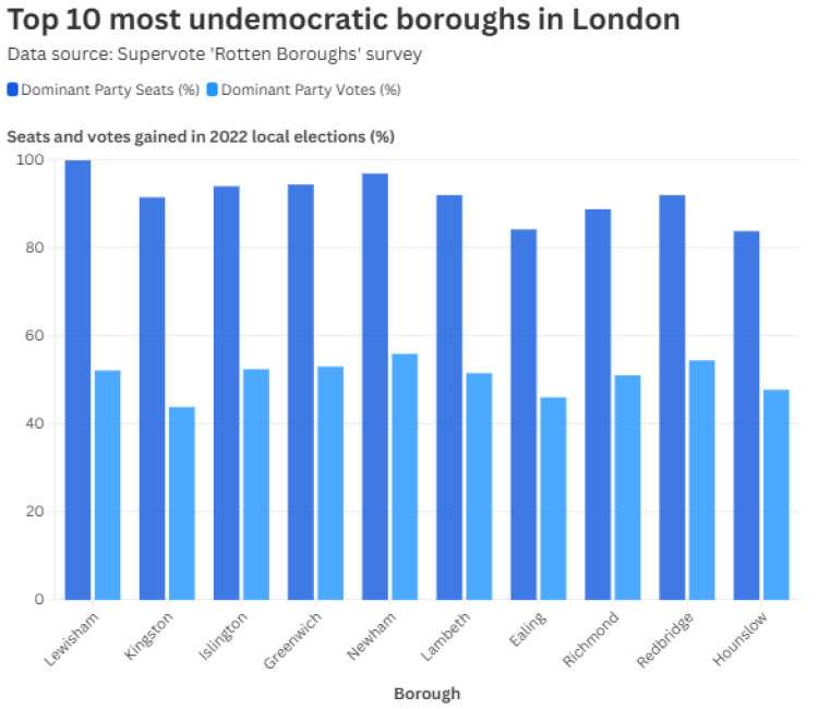 Data from Supervote's Autumn 2025 'Rotten Boroughs' survey, which measures the percentage of seats parties win in relation to their vote share, put Kingston second behind only Lewisham.