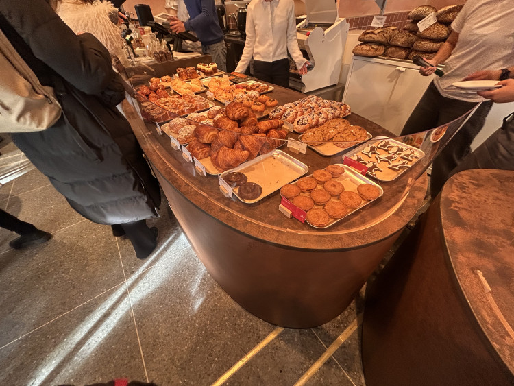 It also has a long front counter exhibiting a variety of freshly baked goods and other snacks.