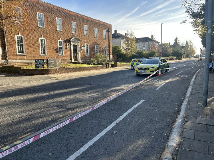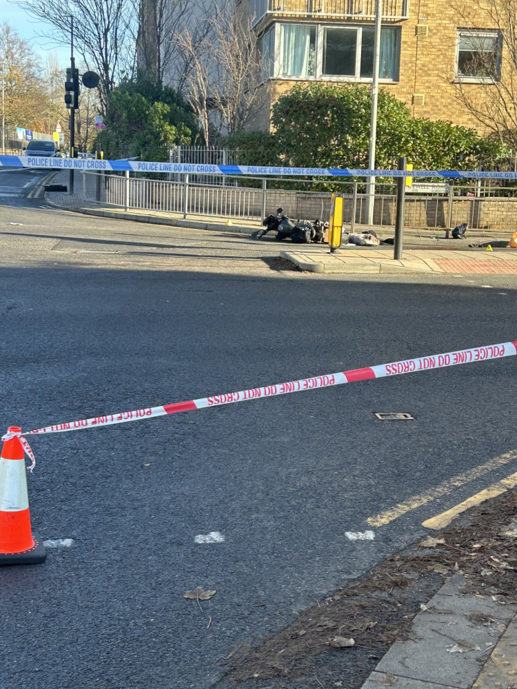 Police tape is surrounding the area, toward the crossing, and down part of Ewell Road.