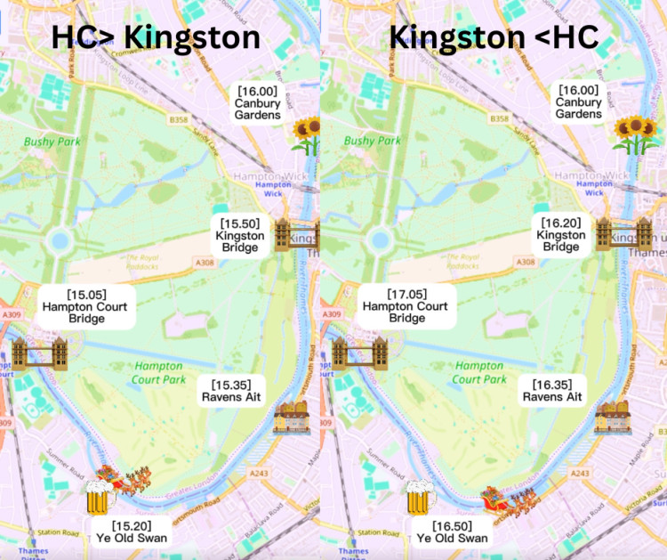 The boat will depart Hampton Court Bridge around 3.05pm and stop at Ye Old Swan, Ravens Ait, Kingston Bridge, and Canbury Gardens – before dancing merrily back to Hampton Court Bridge at approximately 5.05pm.