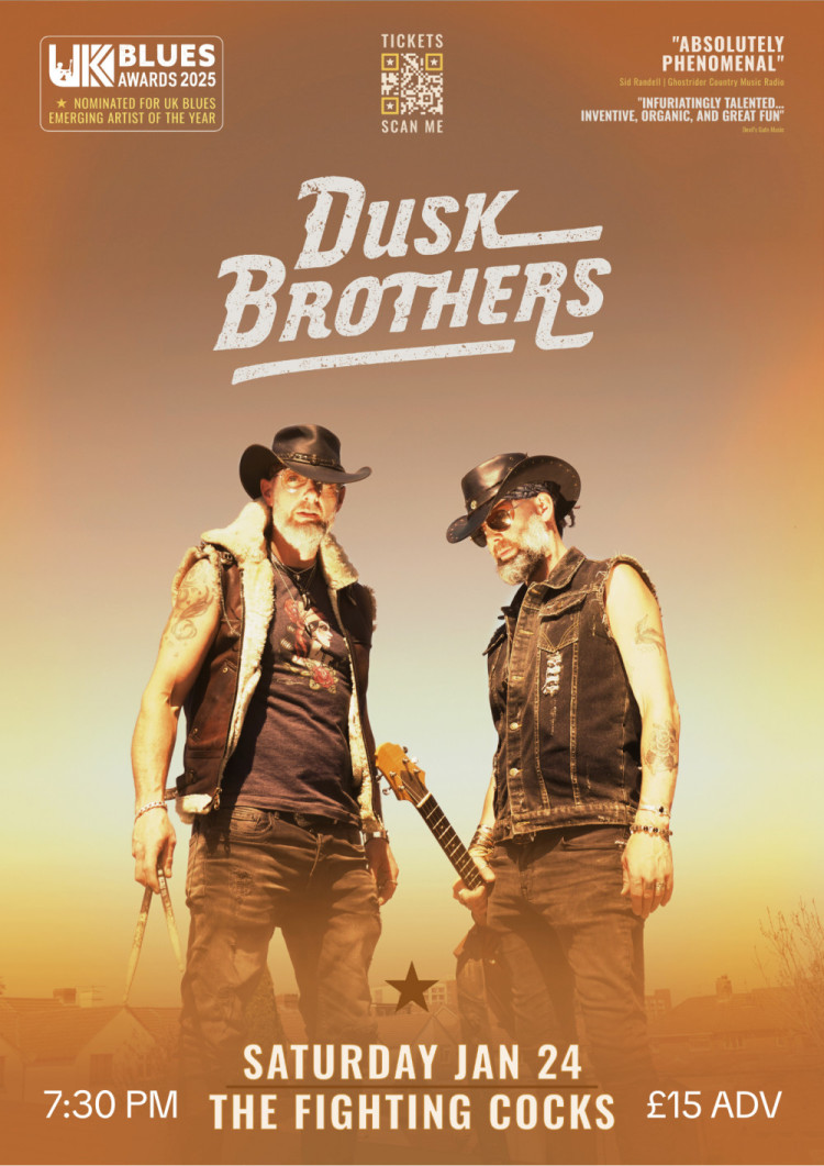 Dusk Brothers are bringing their dark, foot-stomping, junkyard blues back to The Fighting Cocks – raw, loud, and right up close.